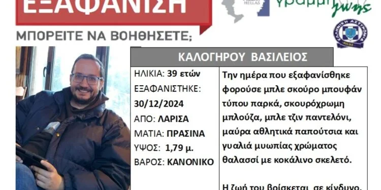 Ο 39χρονος Βασίλης Καλογήρου εξαφανίστηκε μυστηριωδώς από τη Λάρισα, χωρίς να υπάρχουν σαφείς ενδείξεις για το τι συνέβη.