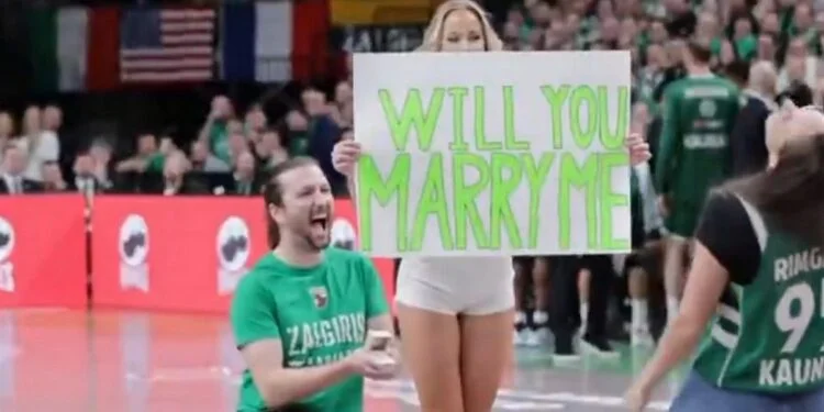 Ο φανατικός οπαδός της Ζάλγκιρις αποφάσισε να κάνει την πρόταση γάμου στη σύντροφό του μέσα στο γήπεδο, με μια εκπληκτική εκτέλεση. Η αντίδραση της κοπέλας ήταν συγκινητική και το κοινό ανταποκρίθηκε με ζεστά χειροκροτήματα και θερμούς χειρονομίες.