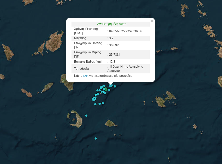 Λίγες ώρες νωρίτερα, το βράδυ της Κυριακής, είχε προηγηθεί άλλη σεισμική δόνηση μεγέθους 3,8 Ρίχτερ, με επίκεντρο 15 χιλιόμετρα νότια-νοτιοδυτικά της Αρκεσίνης Αμοργού.