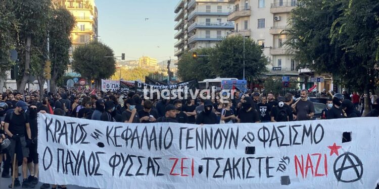 Αυτήν την ώρα, στο κέντρο της Θεσσαλονίκης, πραγματοποιείται μια αντιφασιστική πορεία για τη μνήμη του Παύλου Φύσσα, ενός αντιφασίστα και καλλιτέχνη της ραπ που δολοφονήθηκε πριν 12 χρόνια. Συλλογικότητες, αντιεξουσιαστικοί, φοιτητές και μέλη της εξωκοινοβουλευτικής Αριστεράς συμμετέχουν στην πορεία, φωνάζοντας συνθήματα υπέρ του Παύλου Φύσσα και ενάντια στους ναζί.