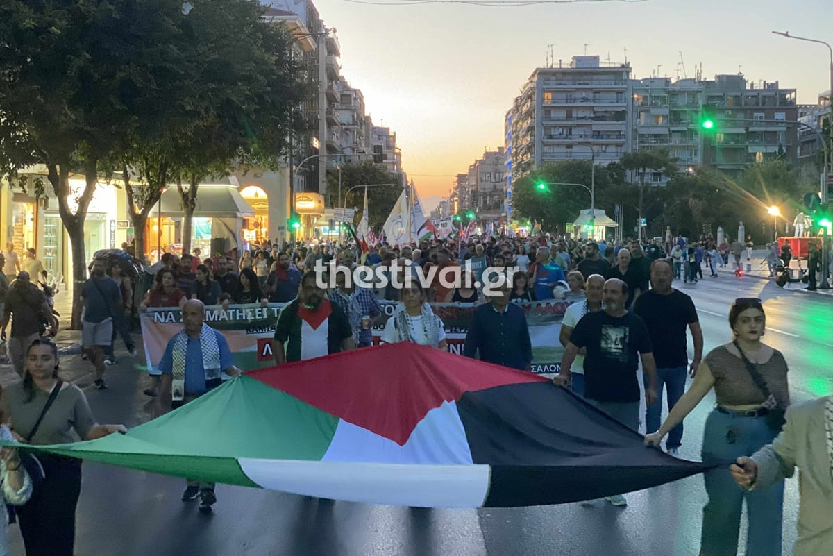 Συμβαίνει αυτή τη στιγμή στο κέντρο της Θεσσαλονίκης μια πορεία αλληλεγγύης προς τον παλαιστινιακό λαό. Οι συμμετέχοντες ξεκίνησαν από το άγαλμα του Βενιζέλου και κινούνται προς το κέντρο της πόλης, εκφράζοντας την αντίθεσή τους στην καταπίεση που υφίστανται οι Παλαιστίνιοι από το Ισραήλ.
