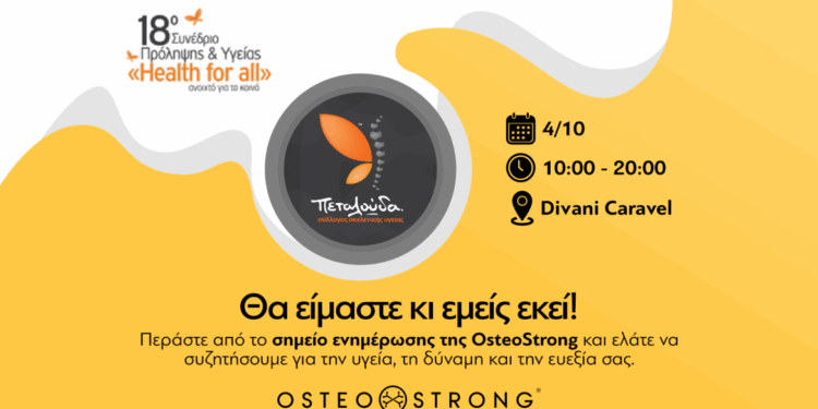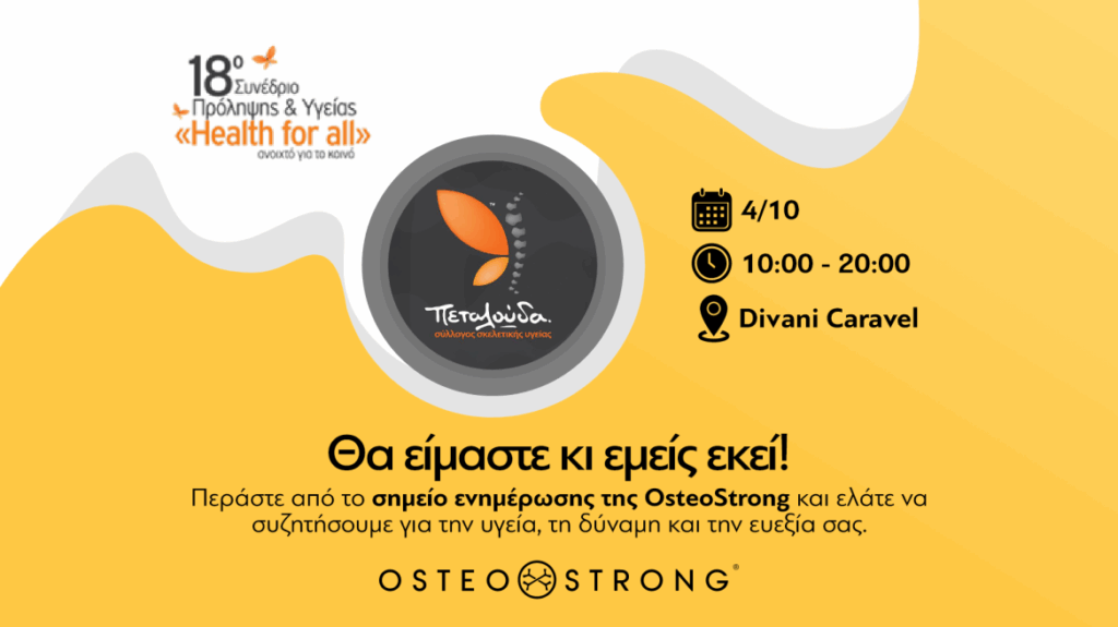 Σας καλούμε λοιπόν στο Divani Caravel το Σάββατο 4 Οκτωβρίου να μάθετε περισσότερα για την OsteoStrong και τον τρόπο με τον οποίο μπορεί να σας βοηθήσει να ζήσετε μια πιο υγιή και ενεργητική ζωή.