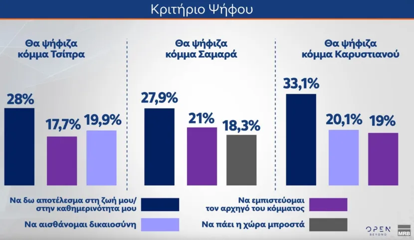 Κύριο κριτήριο ψήφου για τους πολίτες είναι η βελτίωση της καθημερινότητάς τους, με το 28% να δηλώνει πως θα επέλεγε κόμμα που μπορεί να «φέρει αποτέλεσμα στη ζωή του».