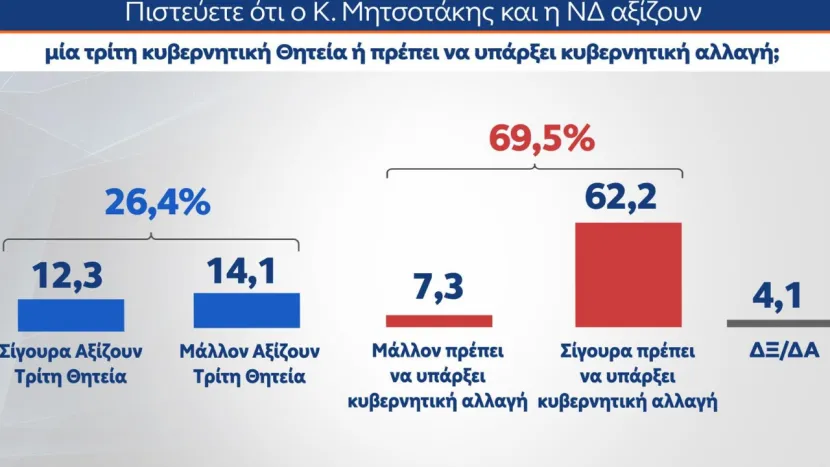 Σύμφωνα με τα αποτελέσματα, μόλις το 12,3% των πολιτών πιστεύει πως ο Κυριάκος Μητσοτάκης και η ΝΔ «σίγουρα αξίζουν μια τρίτη θητεία», ενώ το 14,1% απαντά «μάλλον αξίζουν». Αντίθετα, το 69,5% των συμμετεχόντων θεωρεί ότι πρέπει να υπάρξει αλλαγή στην εξουσία — εκ των οποίων το 62,2% απαντά «σίγουρα πρέπει να υπάρξει αλλαγή» και το 7,3% «μάλλον πρέπει να υπάρξει αλλαγή».