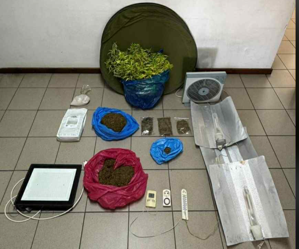 Στο σημείο βρέθηκαν 67 φυτά κάνναβης ύψους έως και 50 εκατοστών, καθώς και πλήρης καλλιεργητικός εξοπλισμός — λαμπτήρες, θερμόμετρα, ανεμιστήρες, προβολείς, λιπάσματα και ξηραντήριο.