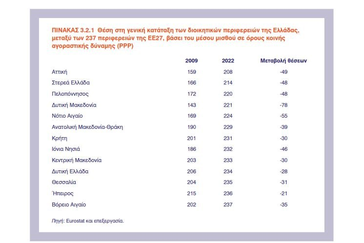 Ενδεικτικά, η περιφέρεια Βορείου Αιγαίου, που το 2009 βρισκόταν στην 202η θέση, το 2022 κατρακύλησε στην τελευταία (237η), ενώ η Ήπειρος καταλαμβάνει την προτελευταία (236η). Συνολικά, μέσα σε διάστημα δεκατριών ετών, οι ελληνικές περιφέρειες έχασαν κατά μέσο όρο περίπου 40 θέσεις στην ευρωπαϊκή κατάταξη.