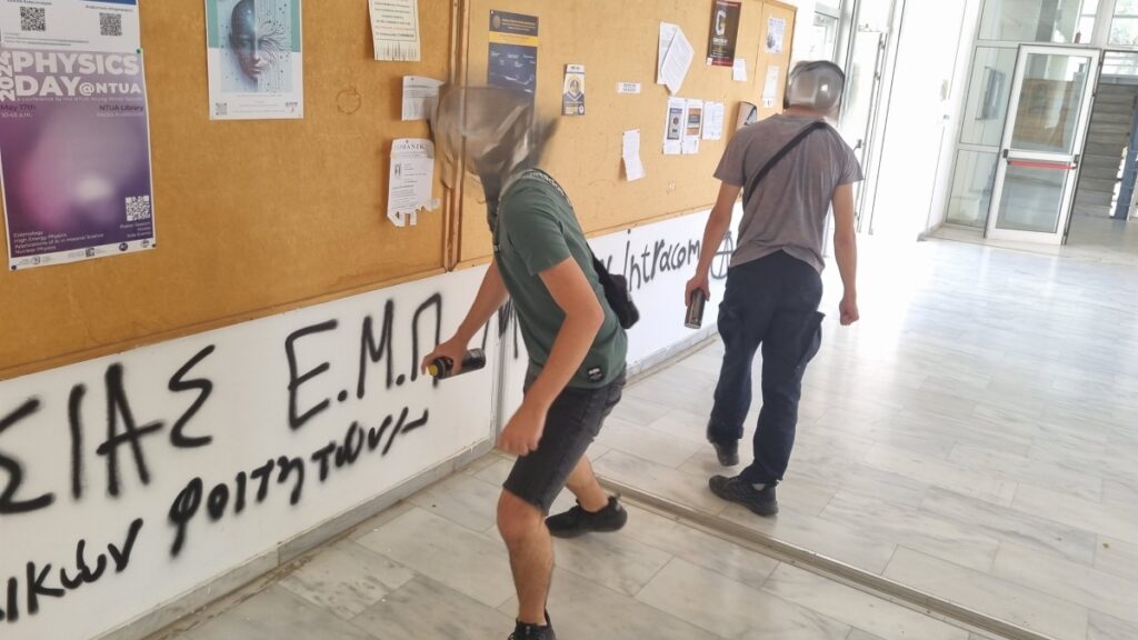 Ο Παναγιώτης Τσανάκας, κοσμήτορας της Σχολής Ηλεκτρολόγων Μηχανικών και Μηχανικών Υπολογιστών του ΕΜΠ, περιέγραψε το περιστατικό σε επιστολή προς την ακαδημαϊκή κοινότητα: «Στις 30 Μαΐου 2024 εντόπισα τυχαία δύο νεαρούς που έγραφαν ανεξέλεγκτα συνθήματα σε πολλαπλά σημεία, πάνω σε καθαρισμένους τοίχους της σχολής. Όταν τους ζήτησα να σταματήσουν, αντέδρασαν περιφρονητικά και συνέχισαν. Τους φωτογράφισα και ενημέρωσα τον πρύτανη, ο οποίος προχώρησε σε μηνυτήρια αναφορά».