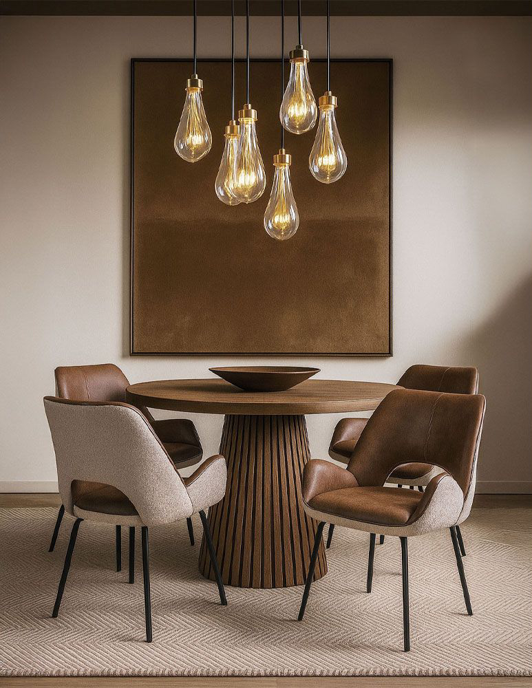 Η διακόσμηση αποκτά δυναμισμό όταν παίζουμε με αντιθέσεις και υφές. Για παράδειγμα, μια γυάλινη τραπεζαρία με μουσταρδί ή δερμάτινες πολυθρόνες δημιουργεί ένταση και στυλ. Τα φυσικά υλικά όπως το ξύλο ή το ρατάν συνδυάζονται όμορφα με υφάσματα τύπου boucle ή velvet.