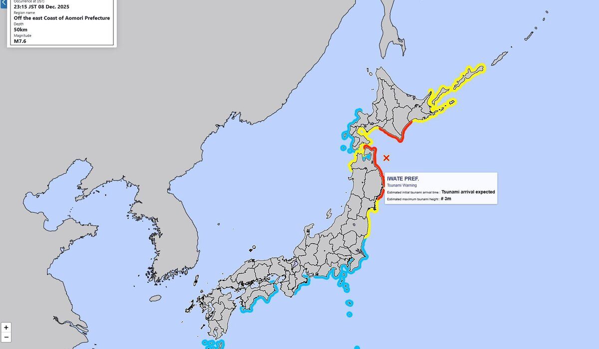 Παράλληλα, εκδόθηκαν προειδοποιήσεις για τσουνάμι στις νομαρχίες Χοκάιντο, Αομόρι και Ιουάτε, ενώ –σύμφωνα με τα στοιχεία της JMA– καταγράφηκαν κύματα ύψους 20 έως 50 εκατοστών σε αρκετούς λιμενικούς σταθμούς της περιοχής.