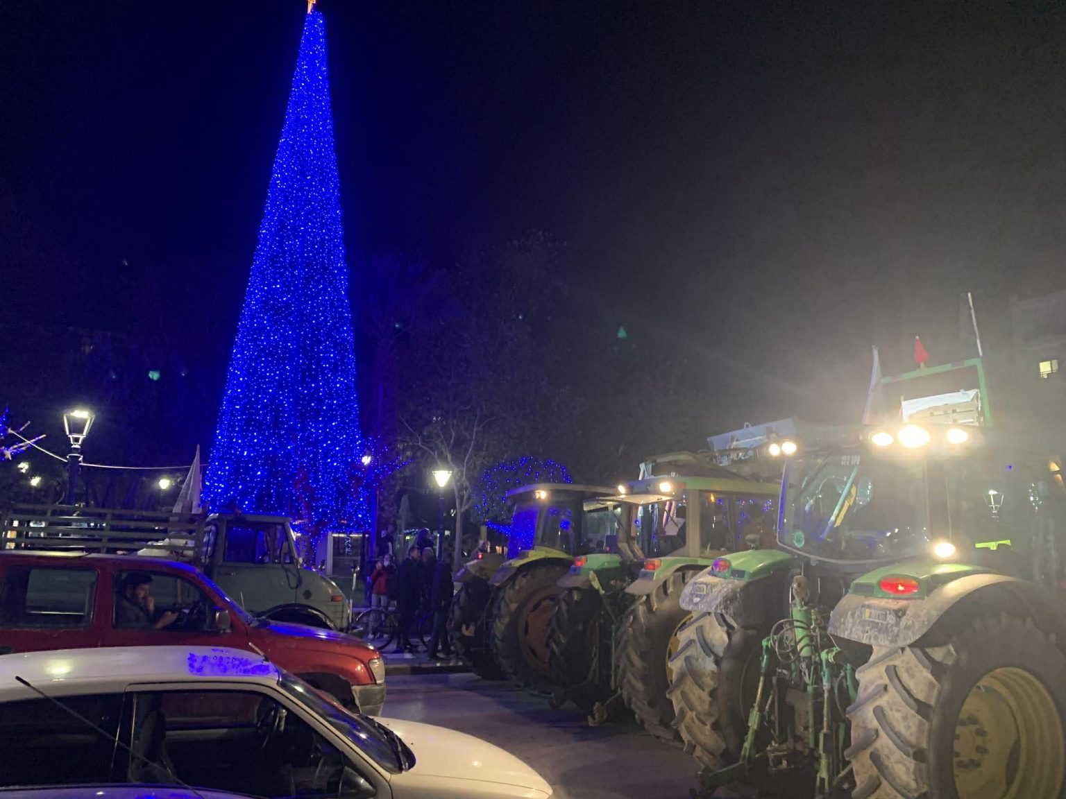 Η εικόνα της κεντρικής πλατείας χαρακτηρίστηκε πρωτόγνωρη, καθώς ήταν χριστουγεννιάτικα στολισμένη και ταυτόχρονα γεμάτη τρακτέρ, πανό και διαδηλωτές.