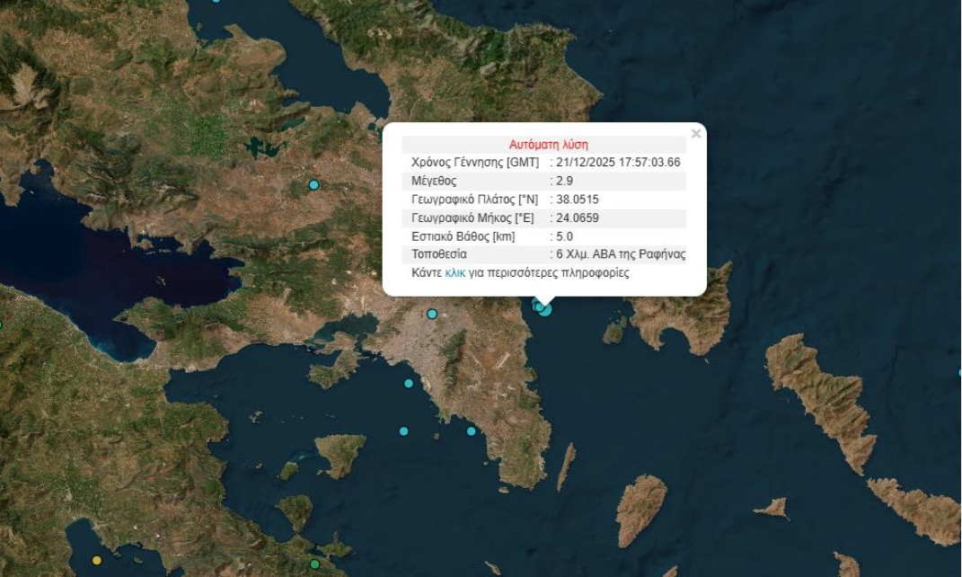 Δύο σεισμικές δονήσεις μεγέθους 2,9 και 2,7 βαθμών της κλίμακας Ρίχτερ καταγράφηκαν το βράδυ της Κυριακής, στις 19:50 και στις 19:57 αντίστοιχα, σε απόσταση περίπου 6 χιλιομέτρων ανατολικά – βορειοανατολικά της Ραφήνας.