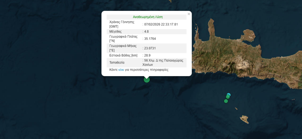 Ισχυρός σεισμός μεγέθους 4,8 βαθμών της κλίμακας Ρίχτερ σημειώθηκε λίγο μετά τα μεσάνυχτα του Σαββάτου (07/02) σε θαλάσσια περιοχή ανοιχτά της Κρήτης, δυτικά της Παλαιοχώρας Χανίων.