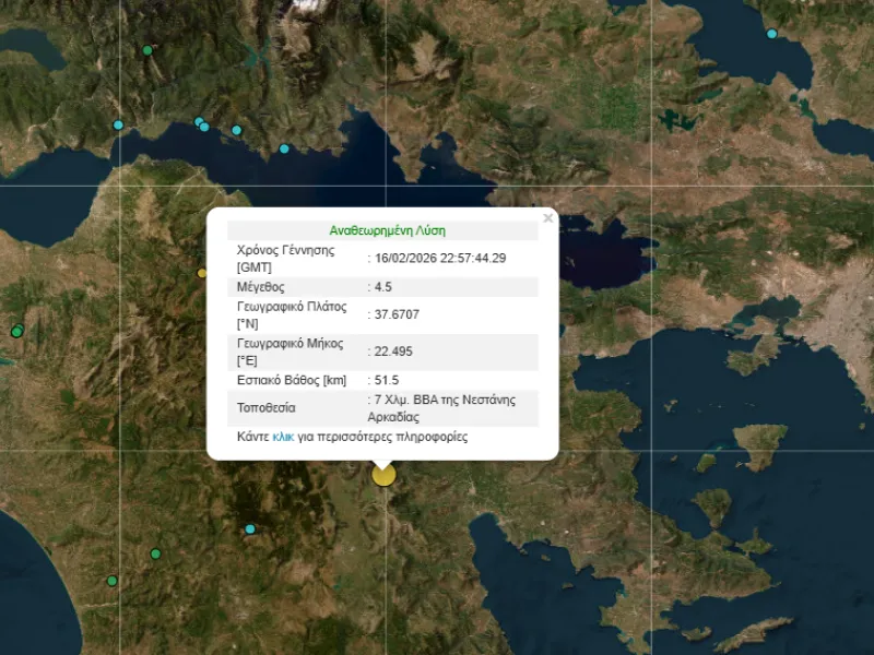 Σεισμός μεγέθους 4,5 βαθμών της κλίμακας Ρίχτερ σημειώθηκε στις 00:57 της Δευτέρας προς Τρίτη στην Αρκαδία.