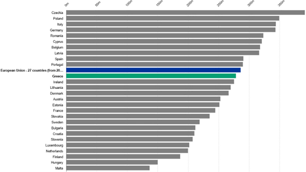 Η Ελλάδα κατατάσσεται 4η ακριβότερη χώρα στην Ε.Ε. σε κόστος ενέργειας και προμήθειας.