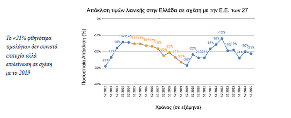 Η διαχρονική επισκόπηση δείχνει ότι οι τιμές λιανικής στην Ελλάδα διατηρούνταν σταθερά κάτω από τον ευρωπαϊκό μέσο όρο, στοιχείο που καθιστά το -21% του 2025 όχι κάποια πρωτόγνωρη επιτυχία, αλλά μάλλον υποχώρηση συγκριτικά με προηγούμενα έτη. Ειδικότερα, την περίοδο 2015-2019 παρατηρείται διεύρυνση της απόκλισης – δηλαδή χαμηλότερο κόστος για την Ελλάδα σε σχέση με την Ε.Ε. των 27 – που έφτασε στο -26% και -28% στο τέλος του 2019. Αυτό σημαίνει ότι η σημερινή διαφορά από τον ευρωπαϊκό μέσο όρο έχει περιοριστεί. Μετά το 2019 η Ελλάδα πλησίασε σε επίπεδο ακρίβειας τον ευρωπαϊκό μέσο όρο, ενώ μόνο από το 2023 και έπειτα καταγράφηκε επιστροφή στο -20% κατά μέσο όρο, ποσοστό που παραμένει σαφώς δυσμενέστερο σε σχέση με τα τελευταία χρόνια της περιόδου 2015-2019.