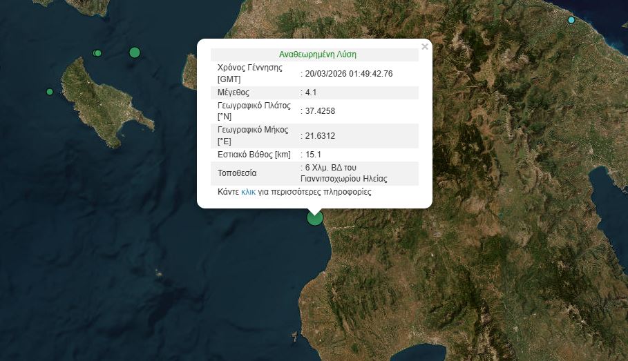 Σεισμός μεγέθους 4,1 βαθμών της κλίμακας Ρίχτερ σημειώθηκε στις 03:49 τα ξημερώματα στην Ηλεία.