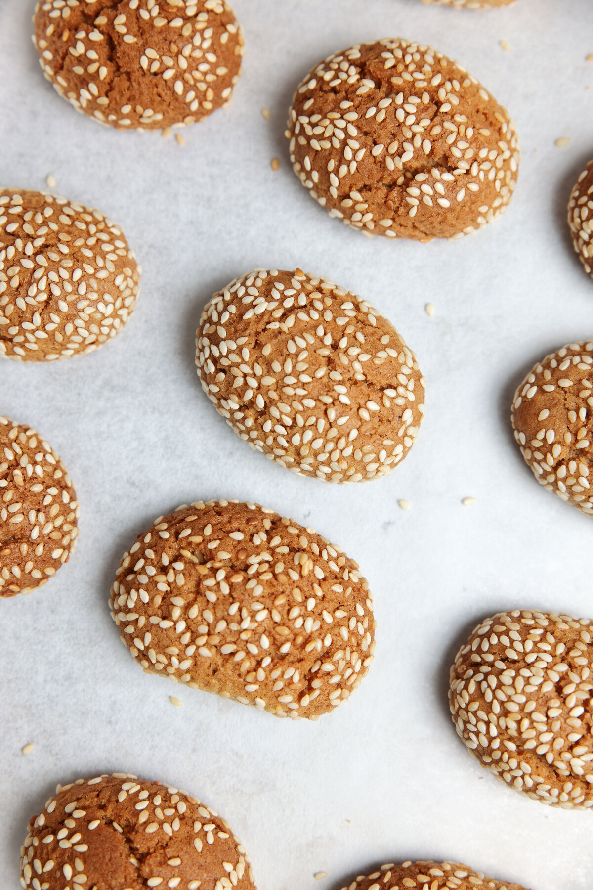 Περνάμε τα κουλουράκια από το σουσάμι και τα τοποθετούμε σε ταψί, το οποίο έχουμε στρώσει με αντικολλητικό χαρτί.